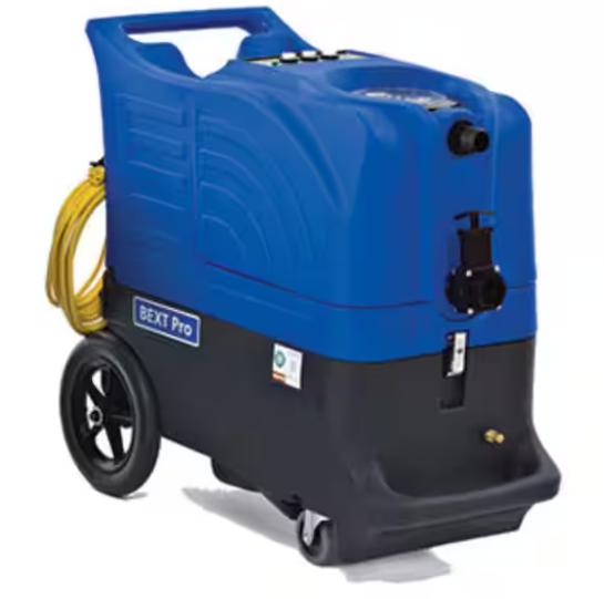 • Uses a hose, wand, and hot water to extract and clean rugs and carpets