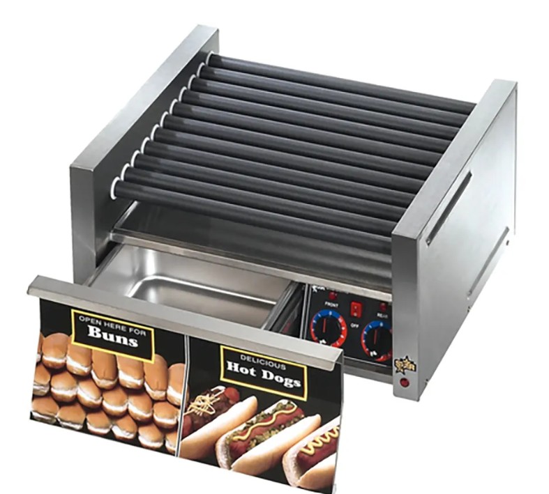• 12 hot dog capacity, adjustable heat settings. Cooking time is 10-12 minutes.